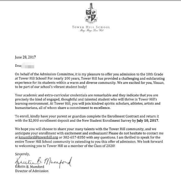 恭喜蔡同学成功补录到顶尖走读高中Tower Hill School(特拉华第一)