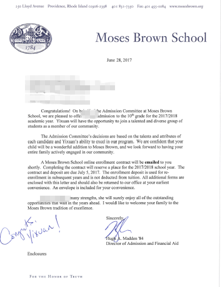 导读:恭喜C同学成功补录到顶尖高中Moses Brown School!这个offer来之不易!凝聚了留美网全体员工的努力和付出!留美网团队用认真的态度,真诚的服务对待每一个孩子!在这里衷心祝愿C同学在美国学业有成!展翅翱翔!》》更多美国高中留学名额拨打电话400-000-7805!石老师微信号:liumeinet2014