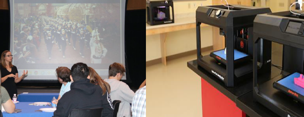 学生在工作室里利用3-D打印机、一体化学习智能板、智能桌和演示剧院等高科技教学设备进行学习互动,锻炼合作创新的能力。