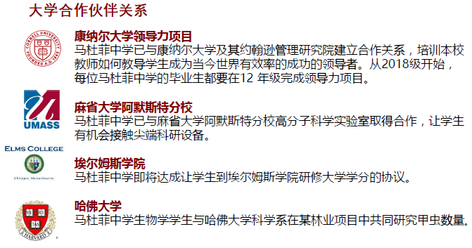 2015 年1月,马杜菲中学与麻省医药与健康科学院宣布合作,保证有资质的学生被世界著名的医学研究大学录取。