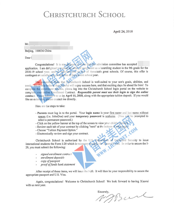 恭喜L同学成功补录到寄宿中学 Christchurch School!祝L同学在美国前程似锦,学业有成!目前留美网前三十的走读和寄宿学校还有少量位置,想申请的同学可以马上咨询:400-000-7805,010-65183908,微信:liumeinet2014