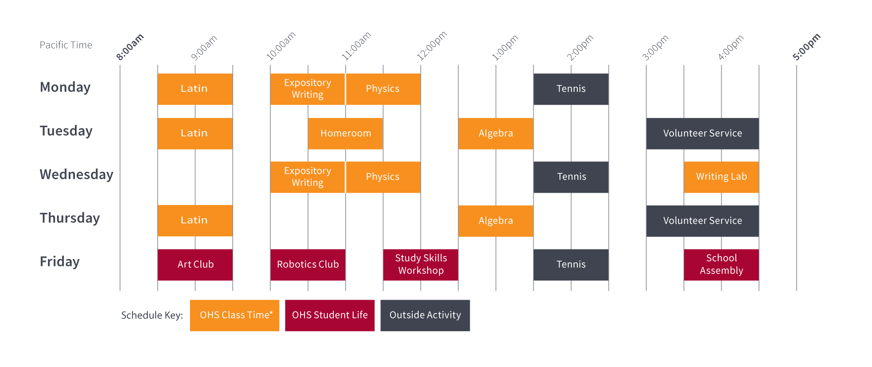 斯坦福在线高中正常每周上课两次、在周一和周三或者周二和周四、语言课程每周上课三次,学生们需要利用课余的时间自己充分的学习,他们还可以利用在线网络中的教学视频进行更多学习。时间上来讲需要把白天两天到三天的课程浓缩到一天,所以这一天的时间将会从早上6:00到晚上10:00或者7:15到晚上9:00。