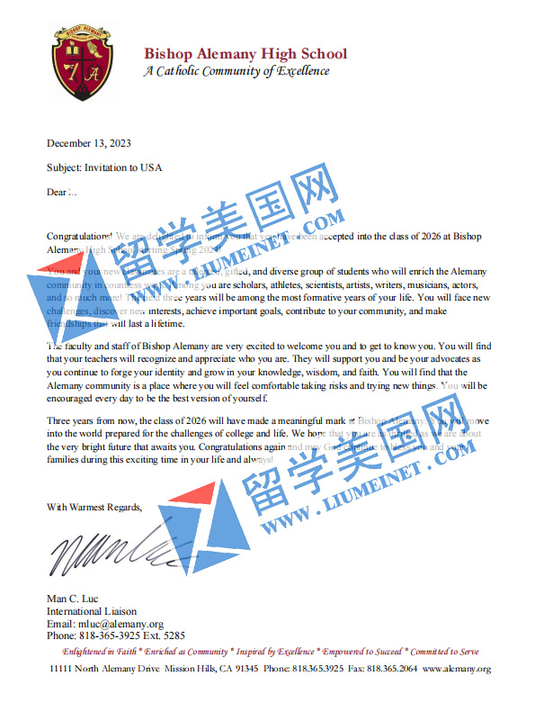 【录取喜报】恭喜留美网M同学斩获Bishop Alemany High School录取offer