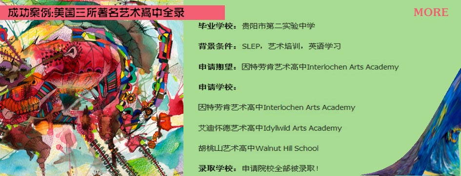 特色4:良好的升学率,就读大学主要有波士顿大学、茱莉亚音乐学院、NYU、加州艺术大学、洛杉矶电影学院、罗德岛艺术学校、宾州州立大学、纽约大学、三藩市艺术大学、丹佛大学等。