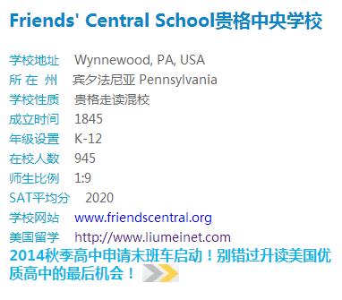 Friends' Central School (FCS)贵格中央学校是一所位于费城郊区的优质走读混校,提供K-12年级的教育。学校初中部和高中部位于一个校区,占地23英亩,小学部位于另一个校区,学校以优质的贵格教育闻名,属于费城最好的高中之一。