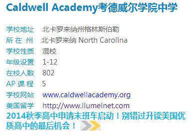 考德威尔学院中学是一所提供全日制1至12年级的有基督教背景的优秀美国私立中学。学校坐落于美丽的城市——北卡罗来纳州格林斯伯勒市,距离北卡罗来纳高新技术产业基地仅1小时车程,交通便利。