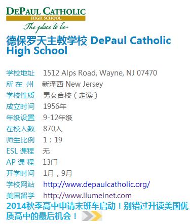 该校是著名的私立学校,位于新泽西州北部地区,紧靠纽约市。该校为师生们提供了一个宜人,安全的育人环境。学校拥有大约900名学生,无论是在教室和运动场,学校的取得的骄傲显而易见。该校有23个校体育代表队和30多种课外活动,因此学生课后活动的选择广泛。来自5个国家和60个地区的学生在德保罗高中接受教育。在德保罗天主教高中打下的扎实的学术基础后,该校超过98%的毕业生顺利进入大学,并充分准备好迎接将要面对的挑战。该校拥有优美的校园环境、近期更新的教育设施和课堂上高科技的设备满足了广大学生的需要。