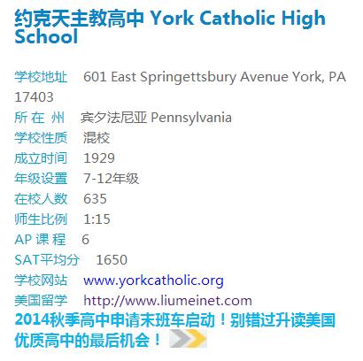 约克天主教高中 York Catholic High School提供了一个综合的教育项目,其中包括了大学预科AP课程,荣誉课程和速成课程,以及大学课程预修项目。学校优秀的教学团队和创新的课程为学校带来了每年较高的入学率。学校的主色调是绿色和金色,校队的名字是爱尔兰勇士。