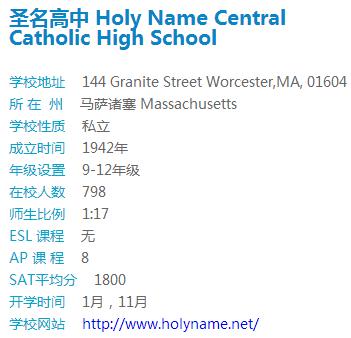 圣名中学是一所男女合校的大学预备学校,是伍斯特教区天主教的中央高中。学生体来自城市中心和周边42个社区,在本校就读的国际学生来自中国,韩国,越南,巴西和墨西哥等国。每个学生在良好的环境中不仅能取得优秀学习成绩,还能发展社会、艺术和体育等各方面的特长,并为建设公正、和平的社会而努力。在圣名中学,我们以向每位学生提供全方位教育机会的使命而自豪。学习、艺术和体育在圣名中学完美的相互结合,这是在同等中学中非常少见的,我们所有的教学工作也都是建立在这种教育理念之上。天主教的环境为每个学生提供了追求卓越学术水平,平衡社会发展,获取艺术和体育成就,建立秩序和维护正义与和平的承诺。
