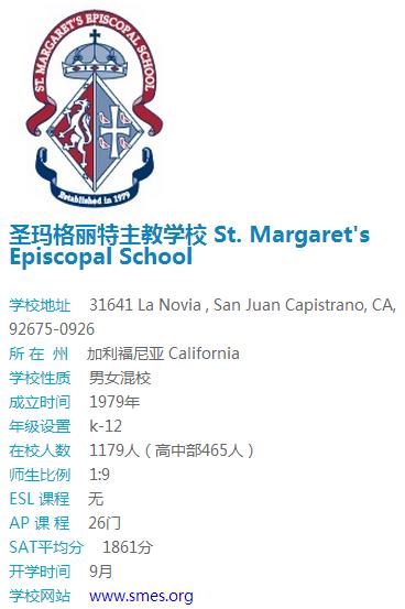 推荐理由:圣玛格丽特学校是南加州优秀学校之一!学校位于风景如画的圣胡安,该地富裕安全,学校的硬件设施非常强,学术优异,SAT平均分1861.