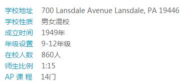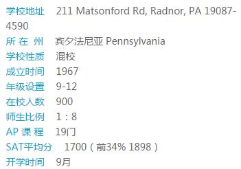 学校建于1967年,学校55英亩的大型校园位于费城西北主线富人区,美丽、安全。学校课程资源丰富,为学生提供大学预备制高中课程,34门荣誉课程,19门AP课程,和大学学分课程;