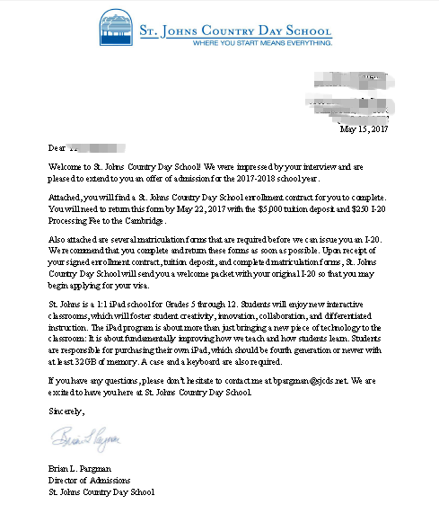 好消息:恭喜Y同学成功补录到St.Johns Country Day School,这个offer来之不易,凝聚了留美网全体员工的努力,预祝Y同学前程似锦,展翅高飞!