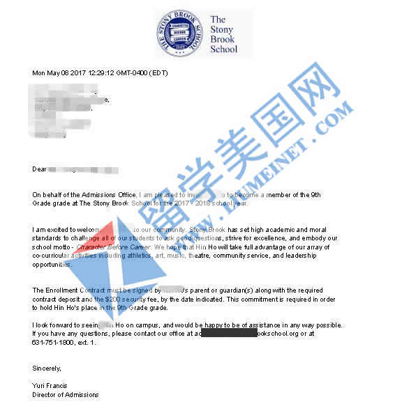 恭喜H同学成功补录到顶尖寄宿the stony brook school石溪中学