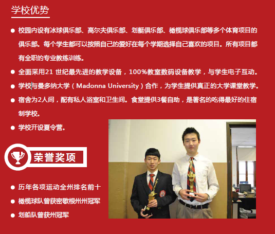 导读:圣玛丽男子高中是一所百年名校,常青藤学子的摇篮,学校提供ESL课程,校园内设有冰球俱乐部、高尔夫俱乐部、划艇俱乐部、橄榄球俱乐部等多个体育项目的俱乐部。历年各项运动全州排名前十;橄榄球队曾获密歇根州州冠军;划船队曾获州冠军;》》申请热线:400-000-7805;微信:liumeinet2014