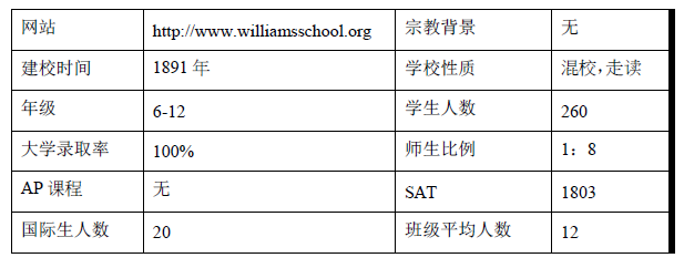 威廉姆斯学校是一所超过一百年历史的无宗教背景的男女合制私立学校。学校语言环境相当好。100%的大学升学率,师生比列低。成立于1891 年,位于顶尖文理学院康涅狄格学院校园内。与康州学院共用750英亩的大学校园,共享所有大学设施。6-12 年级共250 名学生,课堂人数少,精英教育也被极致的发挥。学校课程自主研发Advanced Course,同时兼容AP,同时高年级可以列用大学校园修课。由于靠近海边,所以学校开设帆船运动以及海洋科学项目。学校每年夏天(5个星期)会组织学生出海考察,有多项海洋、工程研究项目。非常注重学生在理工科方面的发展,分别设有两个生物课堂,两个物理课堂,两个化学课堂。力求将学术问题研究彻底。科学类优势:科学、地球环境科学、生命科学、 生物、物理、化学、海洋科学、环境科学等,艺术方面的课程设置包括:戏剧 表演、戏剧制作、舞蹈、爵士乐队、音乐剧、音乐理论、美术、绘画、数码摄像、设计等。学校为每位高年级学生配一名大学升学顾问,从生活和学术两方面全力辅导学生得到最好的大学录取。