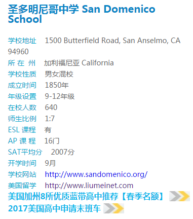 圣多米尼克学校位于加利福尼亚州圣安瑟莫市,校园占地515英亩,招收PK—8(幼儿园到初中)年级的男女混合走读学生和9—12(高中)年级的寄宿女生。在天主教多明圣拉斐尔修女会的支持下,学校成立于1850年,是加利福尼亚州最早成立的一所独立学校。学校极具挑战的学术项目基于多明的核心价值观“学习、反思、服务与社区”。学校拥有一流的教学设施,其中包括一座音乐厅、骑马厩、游泳池、体育馆、一英亩的有机花园、2358块儿太阳能电池板以及六个网球场。学校也是马林县最早为PK—12(幼儿园到高中)年级学生开设了“一对一iPad项目”的学校之一;毕业生录取学校:100%的毕业生进入大学深造。美国大学,波士顿大学,乔治华盛顿大学,约翰霍普金斯大学,东北大学,塔芙茨大学,圣地亚哥大学,圣佛朗西斯科大学,南加利福尼亚大学,本宁顿学院等等。【成功案例】