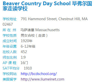 Beaver Country Day School 毕弗尔国家走读学校是美国东部波士顿地区顶尖的私立走读高中,媲美顶尖的寄宿高中。学校建于1920年,占地29英亩的校园位于Chestnut Hill ,距离波士顿市区19分钟,目前只有3名中国学生。学校提供优秀的有挑战性的学术课程,同时注重艺术教育,学校大堂的艺术画廊,非常特别。