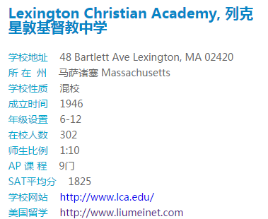 列克星敦基督教中学是一所高水平的大学预备中学,学校学术成就卓越,近几年SAT平均分都在1800分以上,全校AP考试平均分是4,一半以上的学生参加至少一门AP考试和SAT 2考试,几乎每年都能产生National Achievement Award获奖者。学校位于麻省的大波士顿地区,波士顿是麻省的首府和最大城市,也是新英格兰地区的最大城市。该市位于美国东北部大西洋沿岸,紧邻纽约,创建于1630年,是美国最古老、最有文化价值的城市之一。
