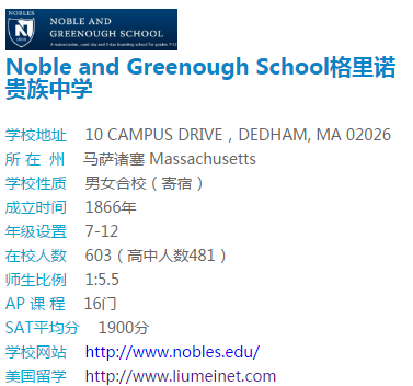 格里诺贵族中学Noble and Greenough School是一所贵族的男女混合制中学。学校拥有187英亩的校园面积,位于东北部新英格兰区的马赛诸塞州,距离波士顿只有10英里的距离(29分钟车程)。目前学校共有603名男女学生,大多数都是来自本州学生,以及周边州学生。优越的学校环境,让更多的莘莘学子们选择来到这所学校就读。每班人数:12.5。
