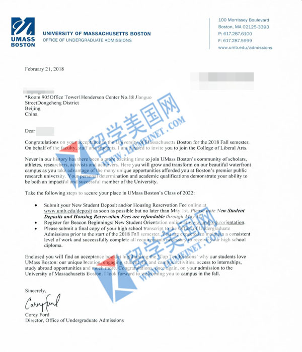 恭喜S同学获得 University of Massachusetts Boston 录取offer