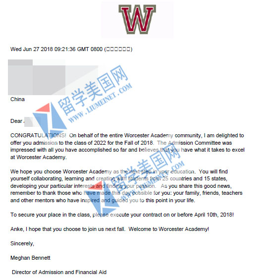 申请过程:恭喜留美网同学补录到顶尖寄宿 Worcester Academy(全美寄宿排名66)!学校位于麻省,地理位置和学术水平极佳!补录阶段,名额很紧缺,接到这个case,留美网与学校协商,最终争取到了面试机会,文案老师加班加点,做面试培训,网上申请,两天时间拿到录取,这个offer来之不易!含金量很高,证明了留美网的实力!在这里也祝贺留美网同学前程似锦!学业有成!
