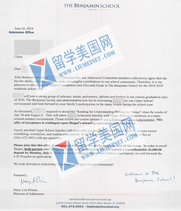 恭喜留美网(www.liumeinet.com)同学成功补录到顶尖走读The Benjamin School,学校位于佛罗里达州富人聚居的棕榈滩(Palm beach),地理位置,气候,学术水平,堪称优秀!感兴趣的同学可以马上咨询:400-000-7805,010-65183908,微信:liumeinet2014