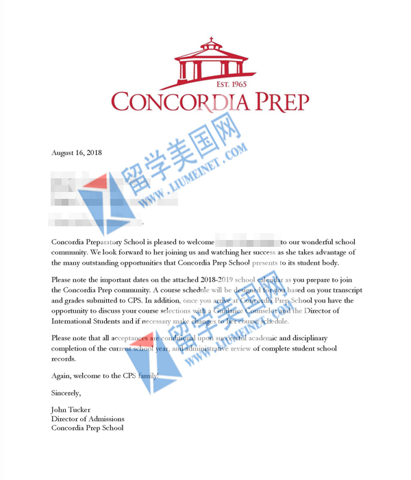 恭喜王同学申请到肯考迪亚预备学校 Concordia Preparatory School