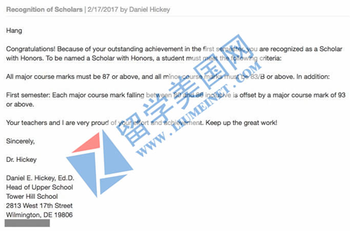 塔山学校这样优秀,留美网学生在塔山也找到了属于自己的一片天。2017年,入读塔山学校一年后,留美网学生获得了优秀学生的称号,塔山学校的校长专门发邮件给留美网学生,祝贺其取得的优异成绩。