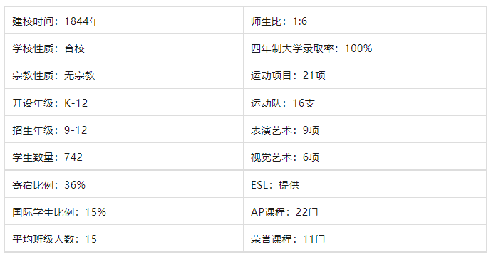 【地理位置】Kingston和Forty Fort位于宾夕法尼亚州东北部,距离纽约市以西2小时,距离费城以北2小时,离巴尔的摩、华盛顿特区和波士顿都不远。 【学校设施】学校分为两部分,高中校区有三块人造草坪、三栋宿舍和五栋教学楼,周边还有滑雪场等娱乐设施。 【学术强校】怀俄明高中拥有强力的学术能力,是美国仅有的14所Round Square会员学校之一,也是宾州唯一的成员学校;学校注重教学质量,自创建以来一直以“教学严谨、管理严格”著称。 【艺术项目】艺术项目全面,有踢踏舞、芭蕾等舞蹈项目,还有视觉艺术和音乐课程。 【体育竞技】该校的男子摔跤项目是全美著名的,曾经贡献多名藤校选手,该校冰球队、曲棍球队也是传统强队。 【课外活动】课外活动方面,学校的俱乐部是非常多的,学生可以根据兴趣进行选择。 【特色项目】该校的人文研究、STEM课程和气候研究课程是比较突出的。 怀俄明高中建于1844年,是美国著名的百年贵族名校,也是美国东北部最古老的中学及大学预科学校。学校注重教学质量,教学严谨是它的代名词,同时学生可通过学校活泼的教学,了解及欣赏艺术、音乐、科学及文学,让学生学会独立自主、有责任心、学会合作、互相照顾、关心世界及尊重他人。 Wyoming Seminary有高中和初中两个校区,高中校区位于宾夕法尼亚州的金斯顿,校园内有三块人造草坪、三栋宿舍和五栋教学楼。在校园之外,当地为徒步旅行和滑雪提供了娱乐场所,附近还有专业运动队和大型音乐活动的设施。初中校区位于宾夕法尼亚州的Forty Fort。 怀俄明神学院上层学校位于宾夕法尼亚州的金斯敦,距离费城、纽约市、华盛顿特区和波士顿只有几个小时的路程。学校所在地是宾夕法尼亚州东北部的怀俄明山谷,这里风景如画,被称为“有心脏的山谷”。Wyoming Seminary是一所杰出的、具有前瞻性思维的独立学校。通过课堂课程、课外活动和领导机会,为学前班到高中的学生实现个人发展。 荣誉课程:代数荣誉课、生物学荣誉、微积分荣誉、化学荣誉、中文荣誉、创新精神荣誉、法国荣誉、希腊语言与文化荣誉、拉丁语荣誉、物理学荣誉、西班牙荣誉 AP课程:美国研讨会-AP英语、文学与AP美国历史、AP生物学、AP微积分AB、AP微积分BC*、化学、AP计算机科学、*先修课程是AP微积分AB、AP英语语言与作文、AP环境科学、AP欧洲历史、AP法语语言与文化、AP拉丁文、宏观经济学、音乐理论、AP Precalculus(新)、大学先修物理课、AP西班牙语语言与文化、AP西班牙文学与文化、统计学、AP工作室艺术-设计、AP工作室艺术-绘画、AP美国政府与政治、AP美国历史、AP世界史 人文与全球研究项目:该项目为期四年,学生重点学习历史、语言、文化和政治方面的知识,学生将在毕业的时候获得人文和全球研究专业的证书。 STEM项目:该项目同样是一个持续四年的项目,分为两个部分。首先是通过课堂上的学术课程进行方向选择,第二是为了配合学术课程考生在接下来需要通过独立项目来完成特定学科的工作,制作一个作品集并且在最后一年完成相应的顶点项目。 气候与可持续发展项目:学生可以专注于研究未来气候变化的科学、全球、经济和社会影响的体验,内容包括实地探查、研究和投资组合的发展,最终同样需要整理成为一个顶点项目。 该校的艺术项目有爵士乐、芭蕾舞、现代舞、踢踏舞等舞种。音乐方面专注于声乐和器乐,学生可以参加管弦乐团和爵士乐团。在戏剧表演方面该校有丰富的经验,除表演之外也可以学习布景、灯光、服装等知识。视觉艺术方面有高级绘画、人物画、二维和三维设计、绘画、版画和两门陶瓷课程。 秋季运动:越野男子大学代表队、越野女子大学代表队、曲棍球队、足球代表队、高尔夫大学代表队、足球男子代表队、女子足球队、网球女子代表队 冬季运动:篮球男子代表队、篮球女子代表队、冰球男子代表队(预备队)、游泳男子代表队、游泳女子代表队、摔跤男子代表队、摔跤女子代表队 春季运动:棒球队、曲棍球男子代表队、曲棍球-女子大学代表队、划船代表队、垒球代表队、网球男子代表队 《怀俄明年鉴》、3D打印俱乐部、工匠俱乐部、亚洲文化俱乐部、航空俱乐部、烘焙俱乐部、圣经俱乐部、男子棒球、男孩篮球、男子曲棍球、男子冰球、男子网球、男孩摔跤、商务俱乐部、象棋俱乐部、古典俱乐部、气候科学和可持续性、越野、纵横字谜俱乐部、舞蹈团、戏剧和艺术、工程俱乐部、环境俱乐部、电子竞技俱乐部、曲棍球、女子篮球、女子曲棍球、女子垒球、女子足球、女子网球、女孩摔跤、历史俱乐部、人文和全球研究集中、器乐、国际俱乐部、投资俱乐部、爵士乐队、实验室、语言中心、数学中心、模拟审判、模拟联合国、同伴辅导、打击乐团、乒乓球俱乐部、棱镜、木偶俱乐部、机器人俱乐部、赛艇运动、科学奥林匹克竞赛、科学研究小组、反对虐待动物、滑雪俱乐部、体育职业俱乐部、舞台工作人员、STEM俱乐部、学生自治、游泳、排球俱乐部、写作中心 美国大学、锡拉丘兹大学、贝茨学院、美国空军学院、哥伦比亚大学、加州大学、德雷克塞尔大学、芝加哥大学、高点大学、科罗拉多大学、拉斐特学院、爱荷华大学、东北大学、斯克兰顿大学、宾夕法尼亚州立大学、范德比尔特大学、普拉特研究所、