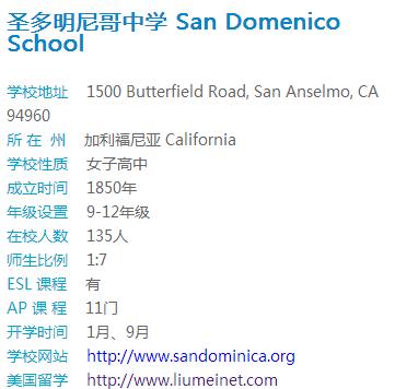 San Domenico School圣多米尼哥高中建立于1850年,拥有一百五十五年的办学历史。位于美国加州,距离旧金山只有20 英里,离机场1小时车程,校园环境优美,林荫环绕,占地面积五百一十五英亩,是一所高质量的美国私立学校。学校分为三个学部:小学,中学及高中;高中仅招收女学生。自成立以来,学校除了扎实学生学习基础,为学生提供高质量的教育以确保学生能够以优异的成绩进入大学学习之外,学校还十分重视学生个人的全面发展。San Domenico School是该州第一所传统的学校,全部女生的环境让学生更能专注的学习。