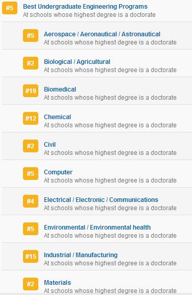 【点评:】工科实力相当强的公立大学,土木工程全美第1,计算机工程全美4,电子工程全美第3.去美国读工科专业,这个学校值得考虑。