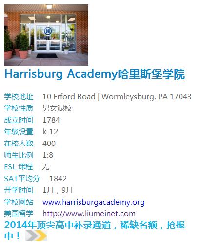 哈里斯堡学院地处Wormleysburg,与哈里斯堡城区隔萨斯奎汉娜河相望,是一所全美私立学校中排名17位历史悠久的高中,至今已有230年历史。学校从1989年开始招收国际学生,在对国际学生的培养方面有着丰富经验。