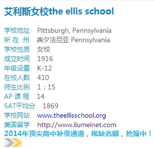艾利斯女校the ellis school环境优美,坐落于距匹兹堡市区约15分钟车程的热闹的郊区,到华盛顿特区及巴尔的摩市仅需4小时车程,并与匹兹堡大学,迪尤肯大学和卡耐基梅隆大学等名校毗邻。