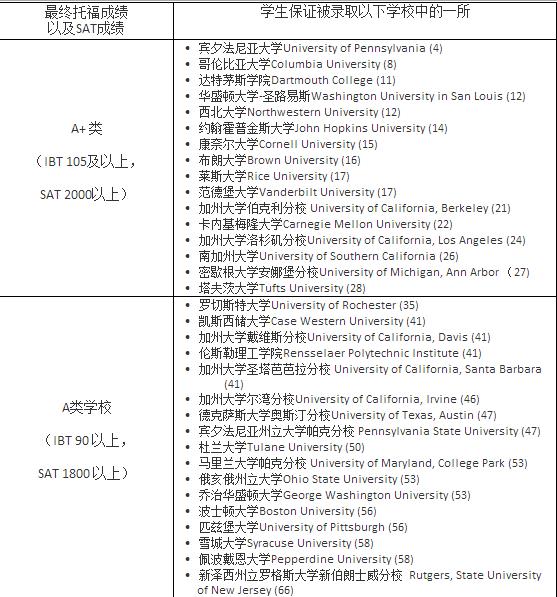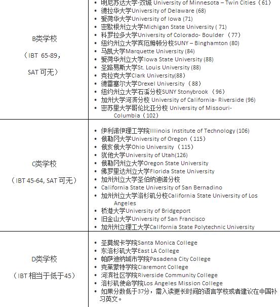 学生经过9-12个月的学习,并且在学习的过程中参加托福和SAT的考试。 在第一个学期以后学生可以要求项目合作方一起申请适合他们自身条件的学校。以下是一个学生可以被录取学校的参考: