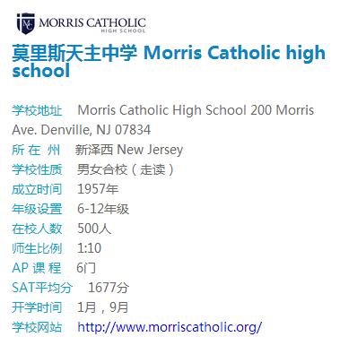 莫里斯天主高中Morris Catholic High School 纽约郊区的高中,有区间车可直达纽约。学校环境具佳,18个世界5OO强公司总部聚集茌这里,人才济济。