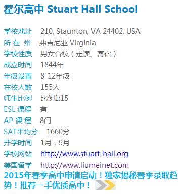 斯图亚特霍尔学校 Stuart Hall School成立于1844年,是一所私立走读和寄宿制教会男女混校,学校走读部分是混校,寄宿部分是女校,学校是弗吉尼亚州最古老的教会学校之一。