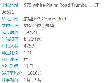 学校坐落于康涅狄格州的特兰伯尔市,地理位置优越,环境优美,毗邻纽约和波士顿,周边名校云集,包括哈佛大学、耶鲁大学、麻省理工学院、莱莉亚音乐学院(全美最好的音乐学府)等。学校师资强大,所有任课老师均有资格证书并且65% 以上的教师拥有硕士学位。高中部多位老师是常青藤大学(哈佛,耶鲁等)毕业生。教职员工经验丰富,平均任职时间超过10年。学校提供荣誉课程及近20 门AP课程,理科最强。选修课更是丰富多样,涵盖科学,艺术,体育等各领域,激发学生潜能。