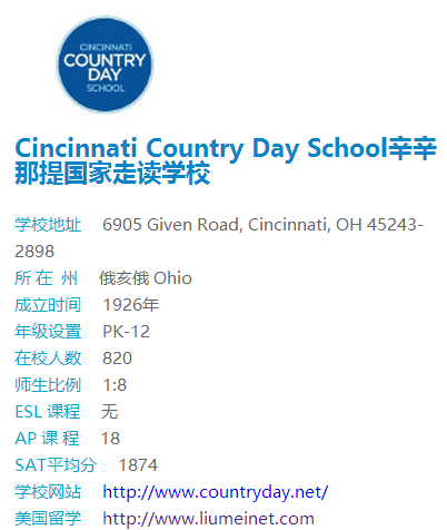 辛辛那提国家走读学校建于1926年,是辛辛那提地区排名第一的贵族名校。不论从社会声誉,硬件师资,学术成绩,艺术体育,课外活动哪方面考量都属于国家级的学校。该校是蓝带学校,蓝带是美国中小学所能获得的最高荣誉,每年只有50所左右的私立高中能获此殊荣,校长均在华盛顿DC由美国总统亲自颁发奖项;该校是NICHE美国中小学排行榜整个俄亥俄州的前10名,辛辛那提的第一名。从师资硬件方面来看,该校是全美第一所全面使用1:1LAPTOP教学的学校,面积高达62英亩的现代化校园中配备了各类高新设施和基础建设,其中教学楼还单配天文望远镜, 光3D打印机就有4台!该校师生比仅为1:8,且教师有94%以上都拥有硕士以上学历。从学术成绩上看,SAT平均分高达1874,ACT达28分!仅2015年学校就获得学术类冠军28个。该校升学率常年100%,且毕业生去向极为顶尖,仅2015届毕业生(一共72人)拿到的录取就有4个阿姆赫斯特学院,2个耶鲁,2个麻省理工,1个哈佛,3个普林斯顿,2个斯坦福,2个布朗,2个芝加哥大学,7个范德堡!几乎包揽了所有常青藤及顶级名校,且总计拿到超过780万美金的奖学金,人均超过10万美金!在体育艺术方面,仅2014-15赛季校队就获得6个体育联盟冠军,4个地区冠军,3个州冠军;且学校还配备声乐,小提琴,钢琴的私教课给有天赋有需要的学生。学校位于辛辛那提最著名的富人区 Indian Hill,学校被无数豪宅环绕,环境非常优越。当然这样顶级的学校竞争也自然十分激烈,开放名额极少,但只要你有充分的准备大可一试,最好的学校给最好的你!