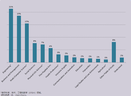 工程,商业管理,数学和计算机科学是2016-17学年国际学生的三大研究领域,占美国高等教育机构国际招生人数的一半以上。值得注意的是,48%的国际学生在STEM领域,并有资格在毕业后延长36个月的OPT。在2015-16-16和2016-17之间,三个研究领域的增长率高于整体国际招生的3%:数学和计算机科学(18%),工程学(6%)以及通信和新闻(4%)。同时,强化英语,教育和人文学科的学生人数减少。英语强化课程的显著下降主要与沙特阿拉伯,中国和巴西的学生入学率下降有关。