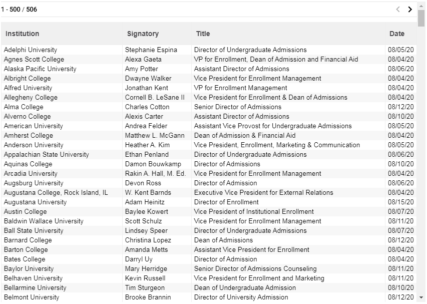 不得不说美国教育界为了留住留学生也算是煞费苦心,NACAC对机构成员提出要求该机构成员学校必须真实执行Test-Optional政策,不会区别对待没有标化成绩的留学生。截止至8月18日上午,已有500多所大学联合签署了该声明。这些学校分别是: