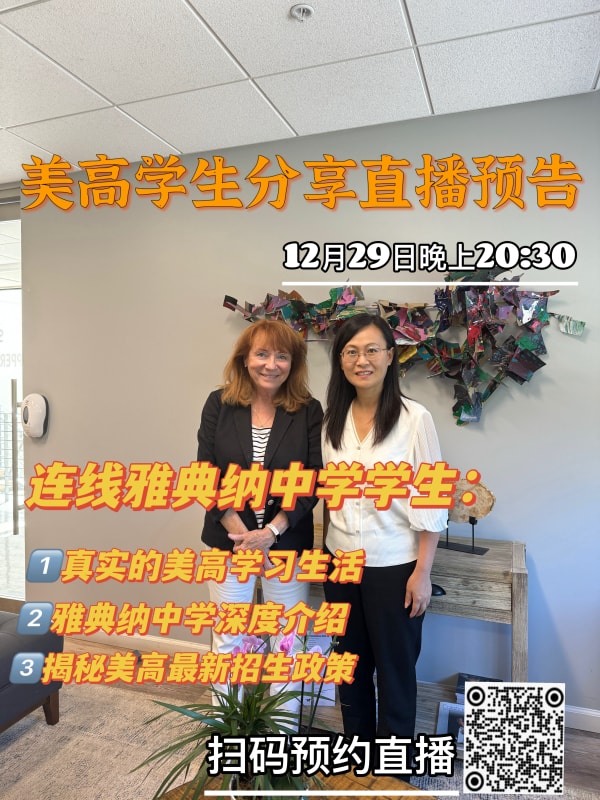 美高在读学生连线直播!本周日晚8点半,石老师将携手雅典纳中学的美高学生,为您带来一场别开生面的直播。在这场直播中,您将全方位了解美高的学习与生活,同时深入剖析雅典纳中学的独特魅力。更值得一提的是,石老师还将亲自揭秘美高的最新招生政策。如此精彩的直播,怎能错过?赶紧扫码预约,锁定直播时间吧!