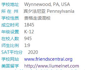 Friends' Central School (FCS)贵格中央学校是一所顶尖走读混校,提供K-12年级的教育。学校位于费城西郊富人区,环境优美。离费城主城区市区只有20分钟车程,占地23英亩。