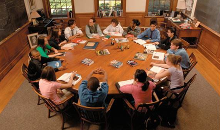 标准的石油继承人和慈善家爱德华·哈克尼斯(Edward Harkness)在20世纪30年代为埃克塞特提供了大量礼物,用于容纳12名学生和他们的老师的椭圆形桌子。哈克尼斯试图通过用基于讨论的方法取代死记硬背的方法来改革教学。通过将老师与学生放在桌子上,可以保持最大的目光接触。这种座位安排鼓励讨论,协作,最重要的是,防止学生躲在课堂后面。
