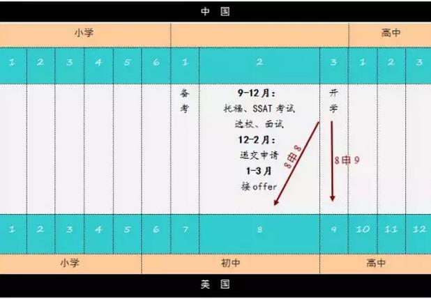 如图所示,只有在初二一开学(9月)就进行标准化考试和申请材料的准备,才有可能在来年1月完成申请,然后在来年的9月入读美国中学。如果是读8年级,就是8申8,如果读9年级就是8申9。