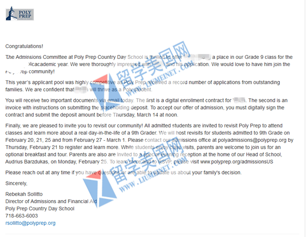 我们留美网团队一边在积极沟通联络美国学校争取补录名额,同时帮助W同学进一步优化申请材料,开展面试培训,助力孩子能够以最好的一面去赢得招生官的青睐,最终成功斩获波利预科走读学校Poly Prep Country Day School的录取offer。