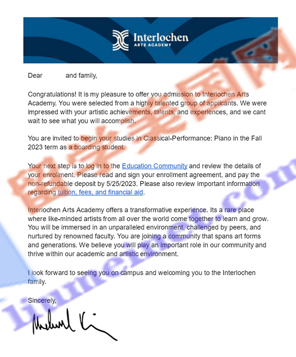 留美网喜报频传,恭喜留美网J同学斩获因特劳肯艺术学院Interlochen Arts Academy录取offer~!