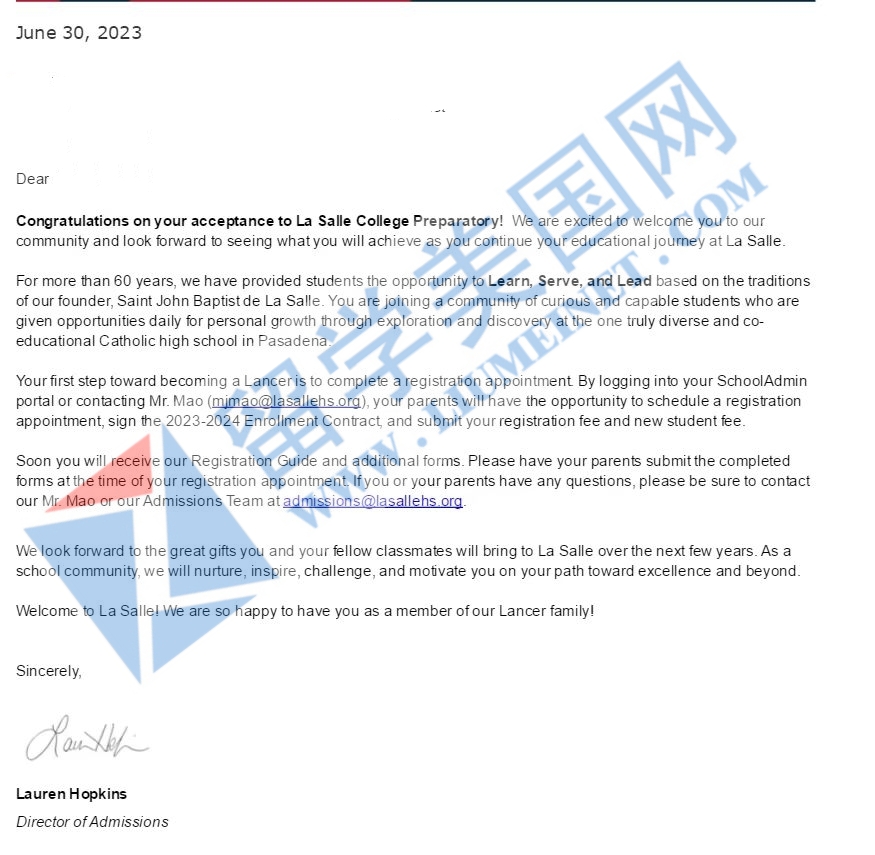 恭喜留美网学子H同学斩获拉萨尔大学预备学校La Salle College Preparatory录取offer!