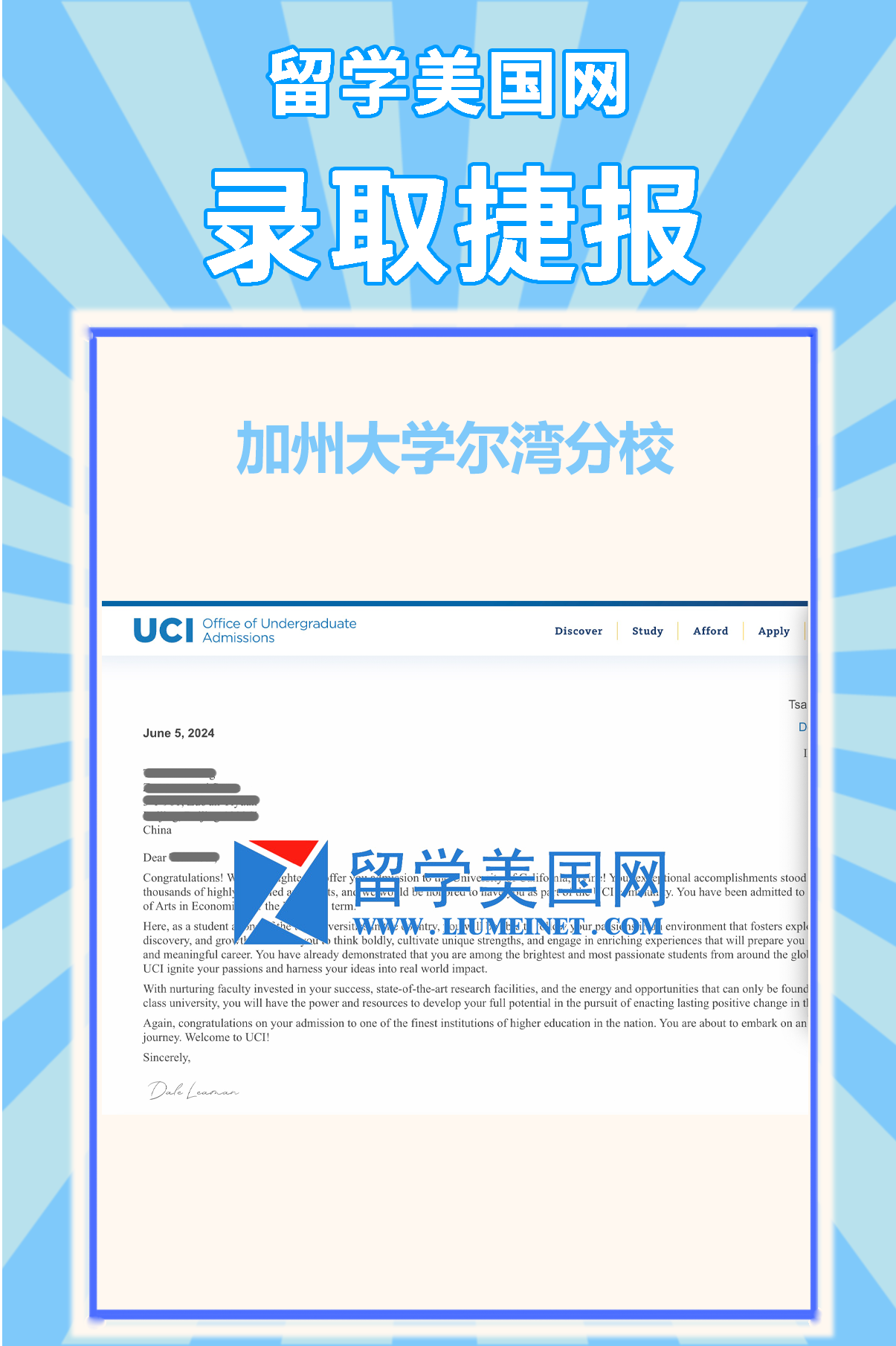 恭喜留美网T同学收获加州大学尔湾分校的录取,他在商科方面的学习很有天赋,同时善于观察生活当中的细节,并且能够利用这双善于发现的眼睛去服务与帮助他人。再次恭喜T同学,祝愿他能够在未来的学习和人生道路上取得更好的成果。