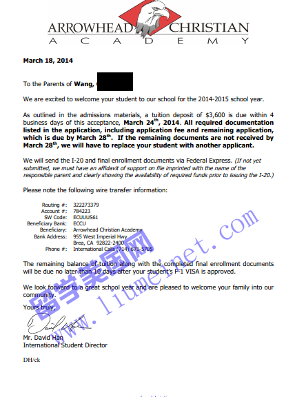 加州的亚罗海德中学学术严格,对国际生关注度高,学生反馈非常好.今年的申请异常激烈,必须要求提供iTEP或者托福成绩,本来孩子是没有希望入读该校的。不过亚罗海德中学与留学美国网有很好的合作关系,连续两年校长亲自来到公司现场给学生面试。尽管王同学口语基础薄弱一些,但是经过文案老师的悉心培训,学生进步非常大,最终在现场面试中获得校长的肯定,在没有语言成绩的前提下破格被录取。