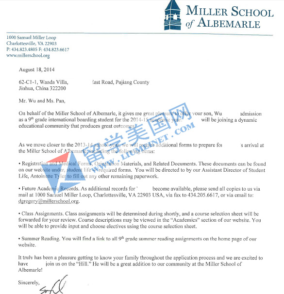 最后,恭喜吴同学获美国东部优质寄宿高中米勒中学录取!
